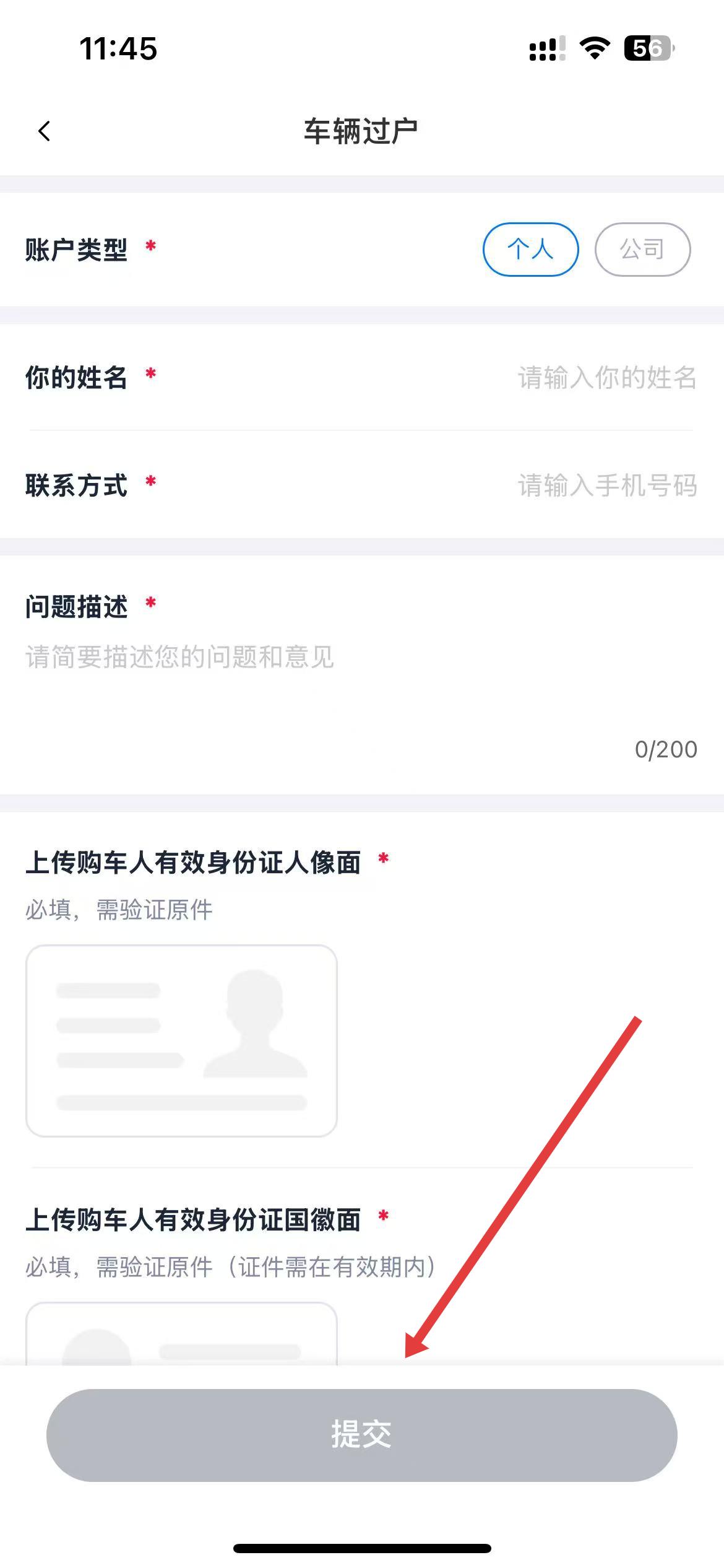 4、在车辆过户页面,选择账户类型等信息,并上传购车人有效身份证人像面和国徽面照片,确认信息无误后点击提交即可。