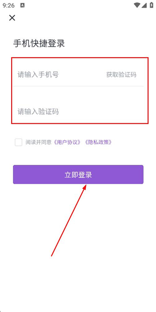 3、在登录页面填写手机号和验证码,勾选协议后,点击登录完成账号登录操作。