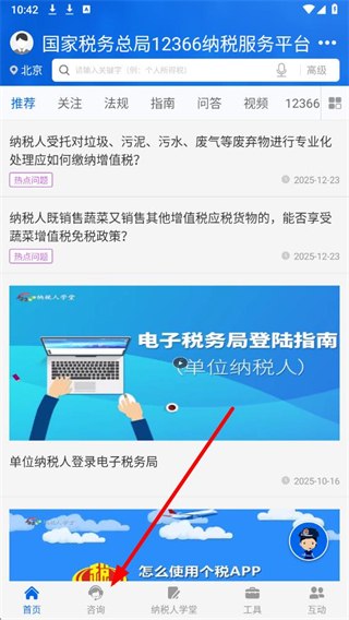 1、进入12366纳税服务平台界面,点击底部导航栏中的咨询选项,进入咨询功能页面。