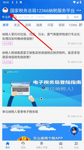 1、进入12366纳税服务平台主界面,可通过顶部搜索栏查询涉税内容,也能浏览推荐的热点问题与办税指南。