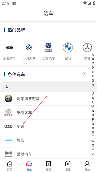 2、在选车页面的条件选车板块,找到并点击奥迪选项,可进入奥迪车型列表页。