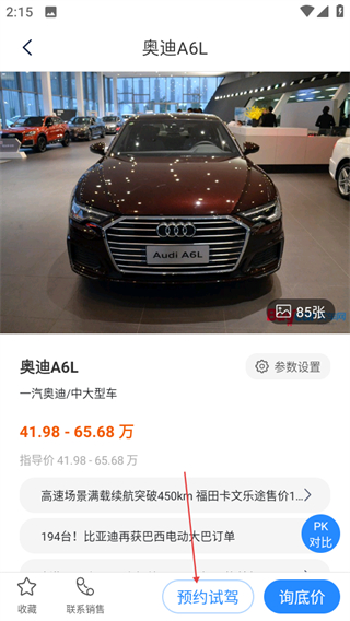4、在奥迪A6L详情页面,点击预约试驾按钮,可发起该车型的试驾预约。