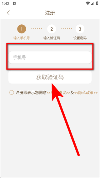 2、在注册第一步页面,输入手机号,勾选后,点击获取验证码。