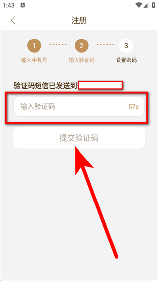 3、在注册第二步页面,在输入框,输入验证码,点击提交验证码。