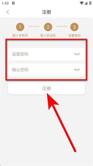 4、在注册第三步页面,设置密码,点击注册,完成账号注册。