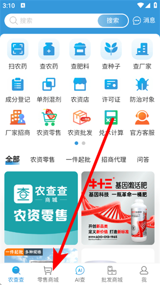 1、打开农查查,点击底部零售商城按钮,进入商城页面。