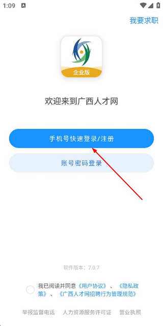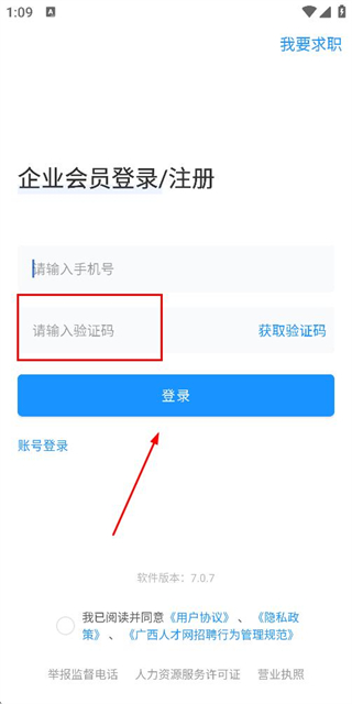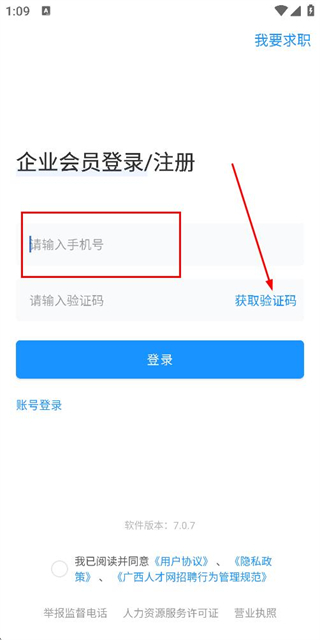 2、在登录页面填写手机号,勾选协议后,点击获取验证码。
