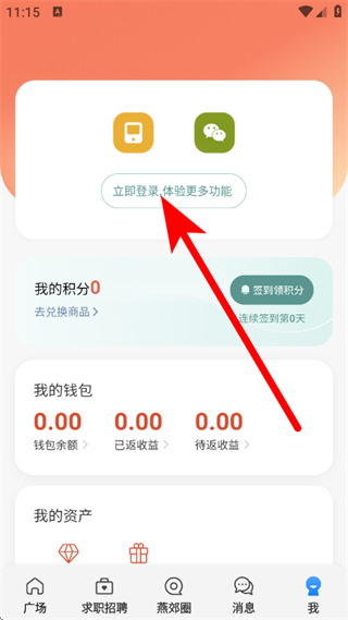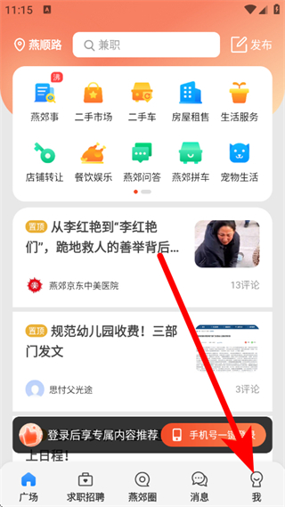 1、在燕郊圈广场页面,点击底部我,进入个人中心页面。