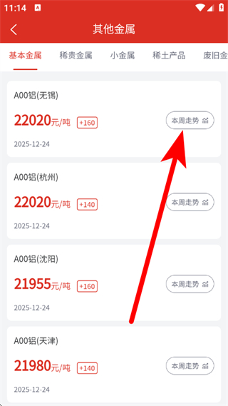3、在其他金属页面,找到目标金属对应的本周走势并点击。