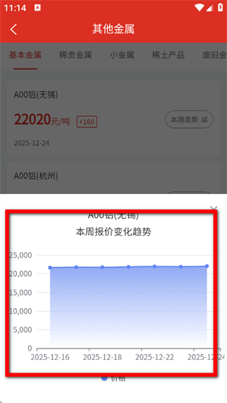 4、在弹窗中,查看该金属的本周报价变化趋势图表,了解价格波动情况。