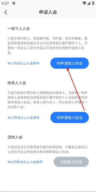 2、在页面点击申请入会按钮,进入入会类型选择页面。
