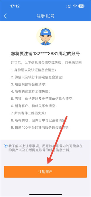 4、在注销账号页面,勾选了解注意事项后点击注销账户按钮即可完成账号注销操作。
