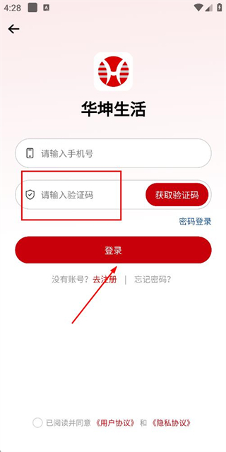 2、在登录页面填写手机号,勾选协议后,点击获取验证码。