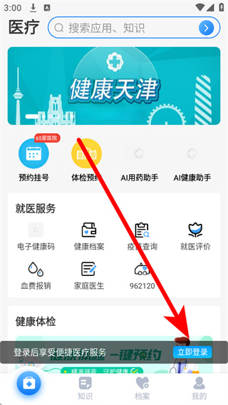 1、打开健康天津,在首页底部点击立即登录,进入登录界面。