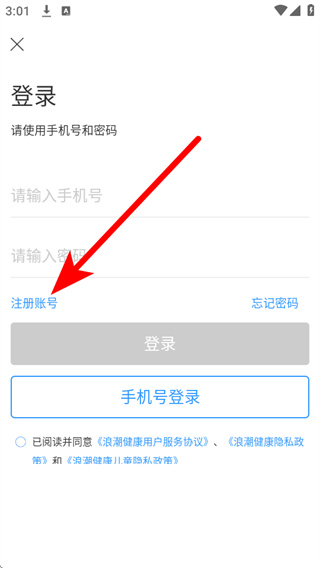 2、在登录界面点击注册账号选项,进入手机号填写页面。