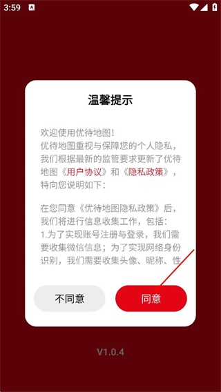 1、在温馨提示弹窗中,阅读隐私政策后,点击同意,继续使用。