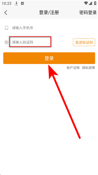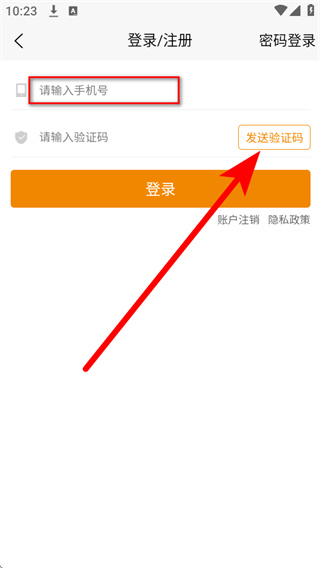 3、在登录注册界面的手机号框中填写要登录的手机号,然后点击发送验证码。