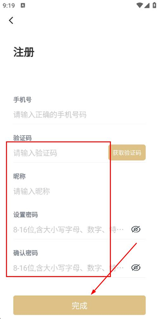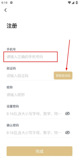 3、在注册账号页面填写验证码、昵称和密码,点击注册完成注册操作。