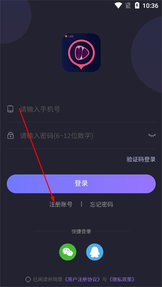 2、在登录界面点击注册账号选项,进入注册页面。
