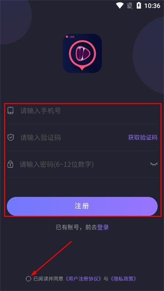3、在注册页面填写手机号、获取并输入验证码,设置密码,勾选协议后点击注册。