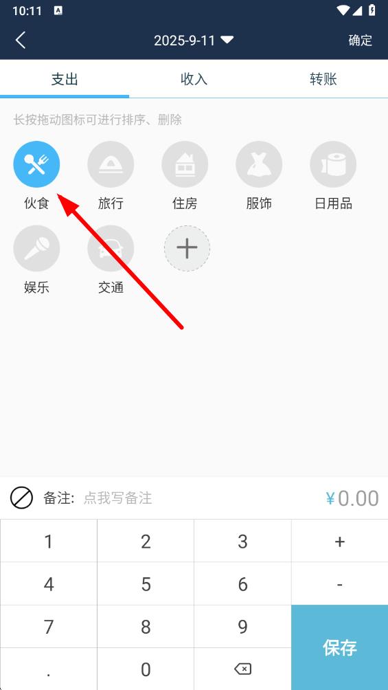 2、在记账界面顶部,选择记账类型,包括支出、收入、转账。
