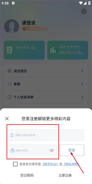 3、在登录窗口输入手机号和密码后,勾选协议点击登录完成登录操作。