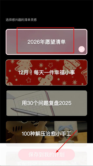 2、在清单灵感选择页面,选中愿望清单后,点击保存到我的计划。