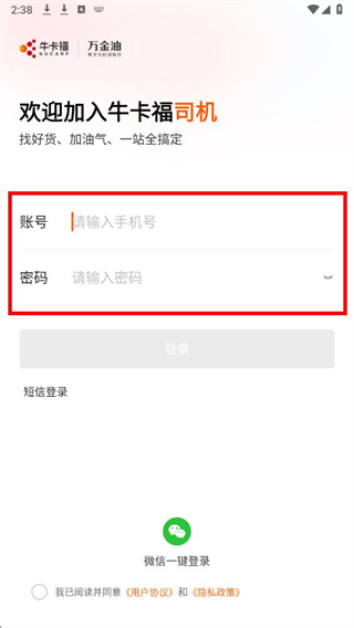 3、勾选同意协议,点击登录按钮,即可完成万金油司机端的密码登录操作。