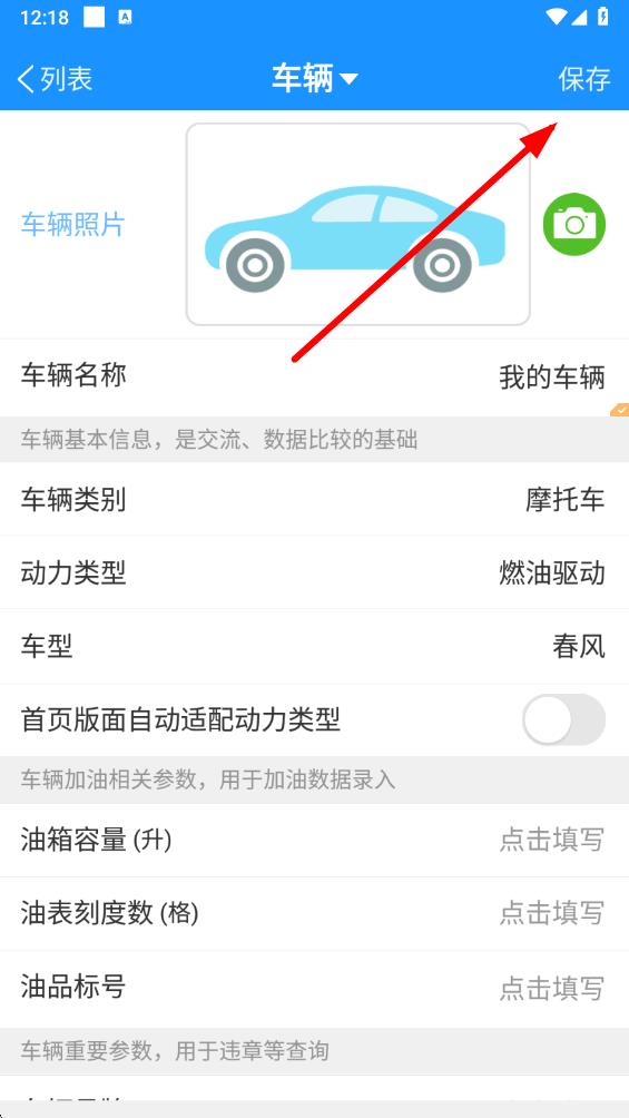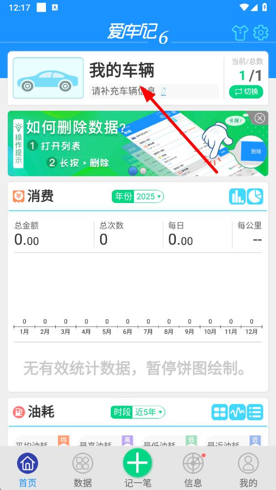 1、打开爱车记油耗版app,在首页点击我的车辆区域,进入车辆信息补充页面。