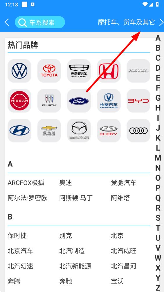 3、在车系搜索界面,点击右上角摩托车、货车及其它选项,进入车辆类型选择页面。