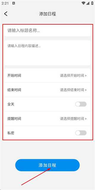 3、在添加日程页面填写日程信息后,点击添加日程按钮完成日程创建。