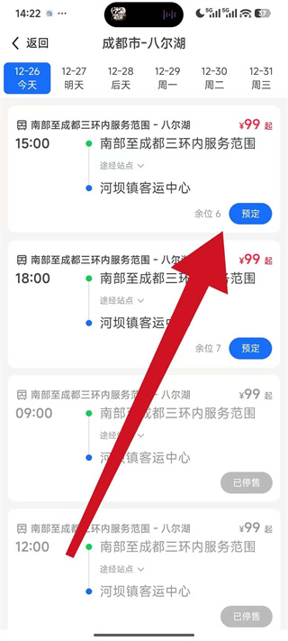 4、在查询结果里,选择合适的班次,点击班次旁的预定,完成后续的购票预约操作。