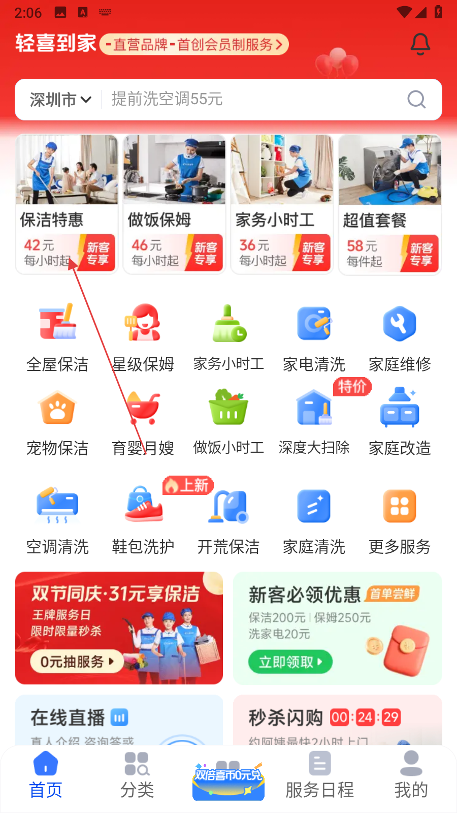 1、打开轻喜到家APP,在首页找到想要拼团的服务,点击进入该服务的详情页面。