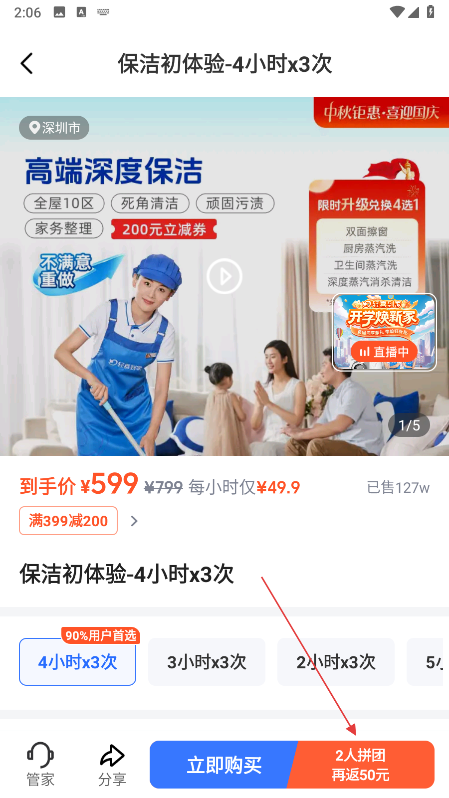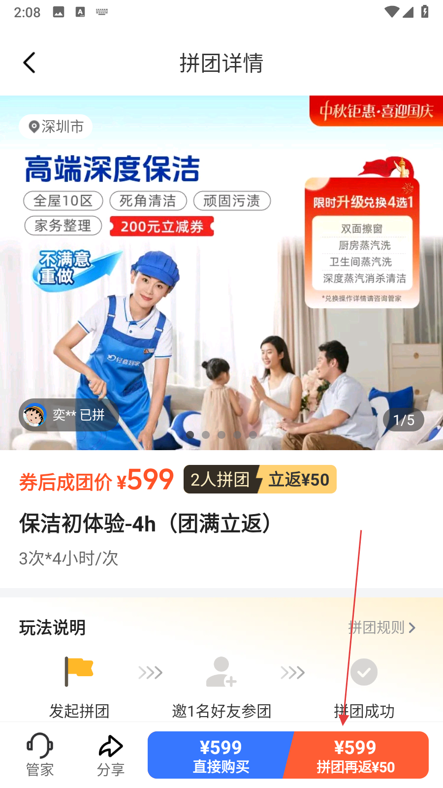 2、在服务详情页面,点击2人拼团再返50元按钮,进入拼团详情页面。