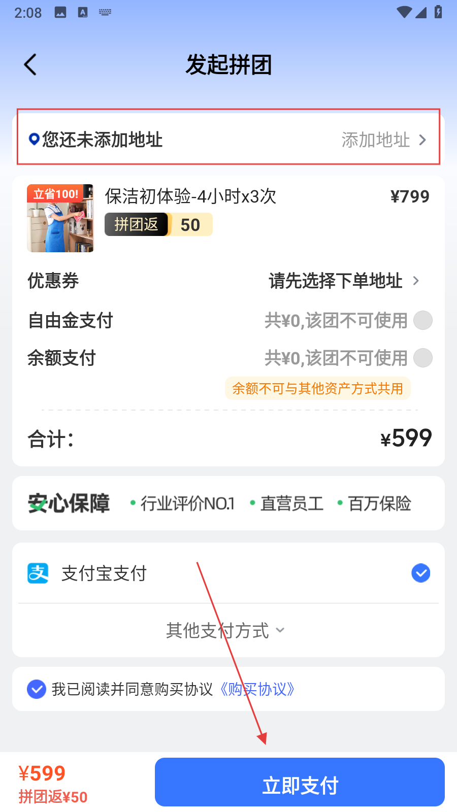 4、在发起拼团页面,先添加下单地址,然后点击立即支付。