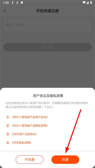 3、在弹出的用户协议及隐私政策窗口中,点击同意按钮,进入手机号填写页面。