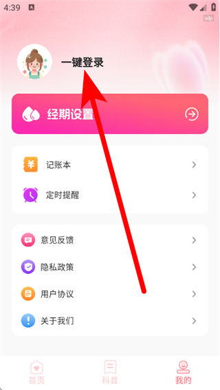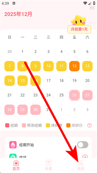 1、在姨妈小记页面,点击底部我的选项,进入个人页面。