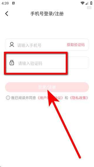 3、在登录注册页面,输入手机号,点击获取验证码。