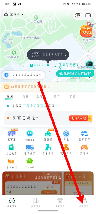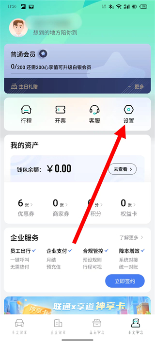 1、进入享道出行首页,点击底部个人中心,进入个人中心页面。