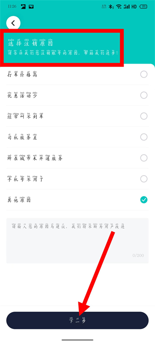 5、在选择注销原因页面,选择注销原因,点击下一步。