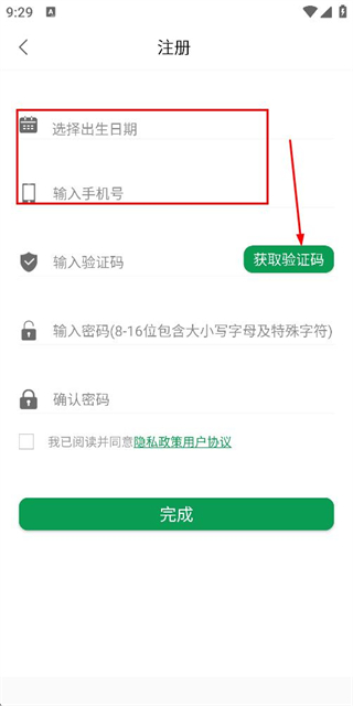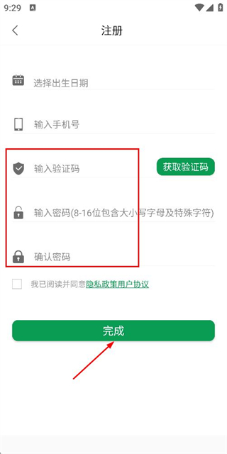 3、在注册账号页面填写验证码和密码,勾选协议后点击完成。