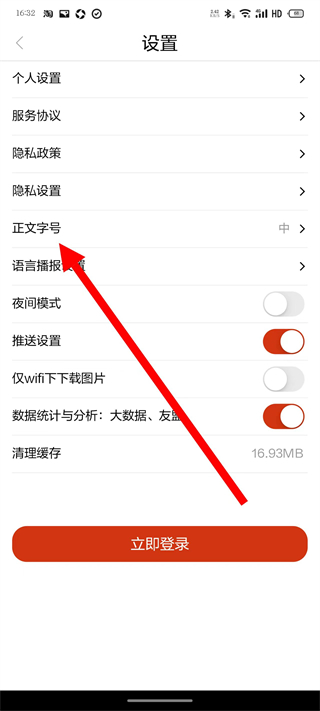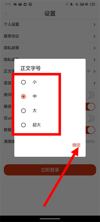 3、在设置页面,点击正文字号选项,弹出正文字号选择弹窗。