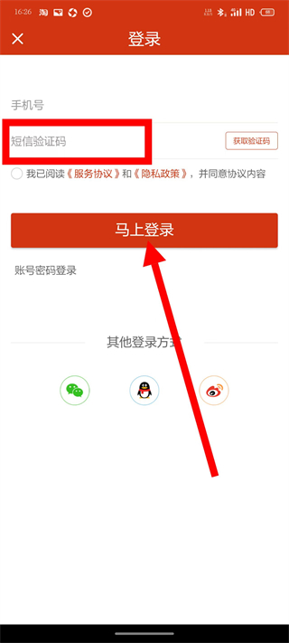 4、输入短信验证码,勾选后,点击马上登录,完成登录。