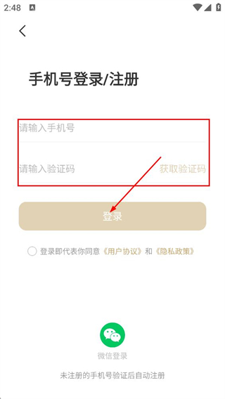 3、在手机号登录/注册页,填写手机号,验证码,点击登录。
