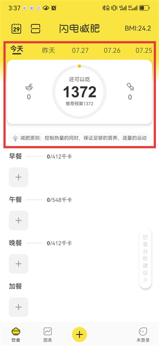 1、在“饮食”页面,可查看当日剩余热量预算,点击早餐/午餐等板块的+,添加对应餐食的热量记录。