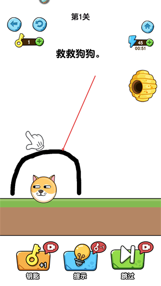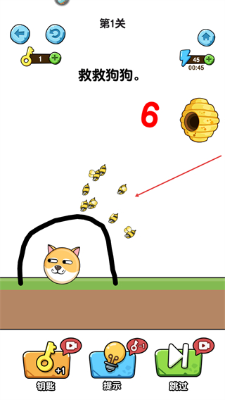 狗狗触碰危险或被蜜蜂蛰咬时,会出现搞笑的反应动画,让失败也变得充满乐趣,不会让玩家产生挫败感,反而更想尝试新的画线策略。