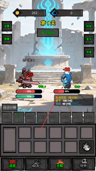 1、在第1关中操控角色攻击敌方,造成伤害积累经验与金币,推进战斗进程。
