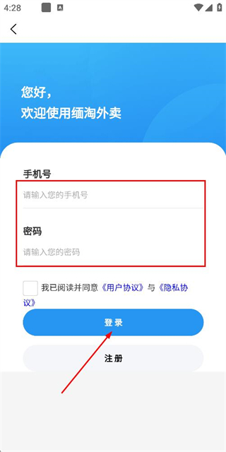 3、在登录页面填写手机号和密码,勾选协议后,点击登录完成账号登录操作。