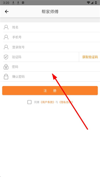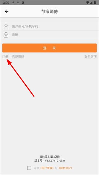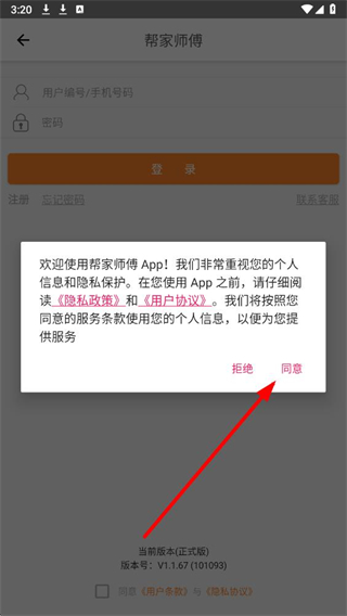 1、打开帮家师傅app后,弹出欢迎使用帮家师傅App的协议弹窗,点击同意按钮。