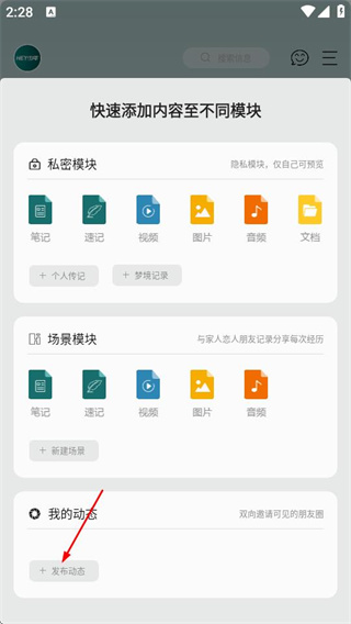 2、在添加页面,点击我的动态下的发布动态选项,可进入动态发布页面。